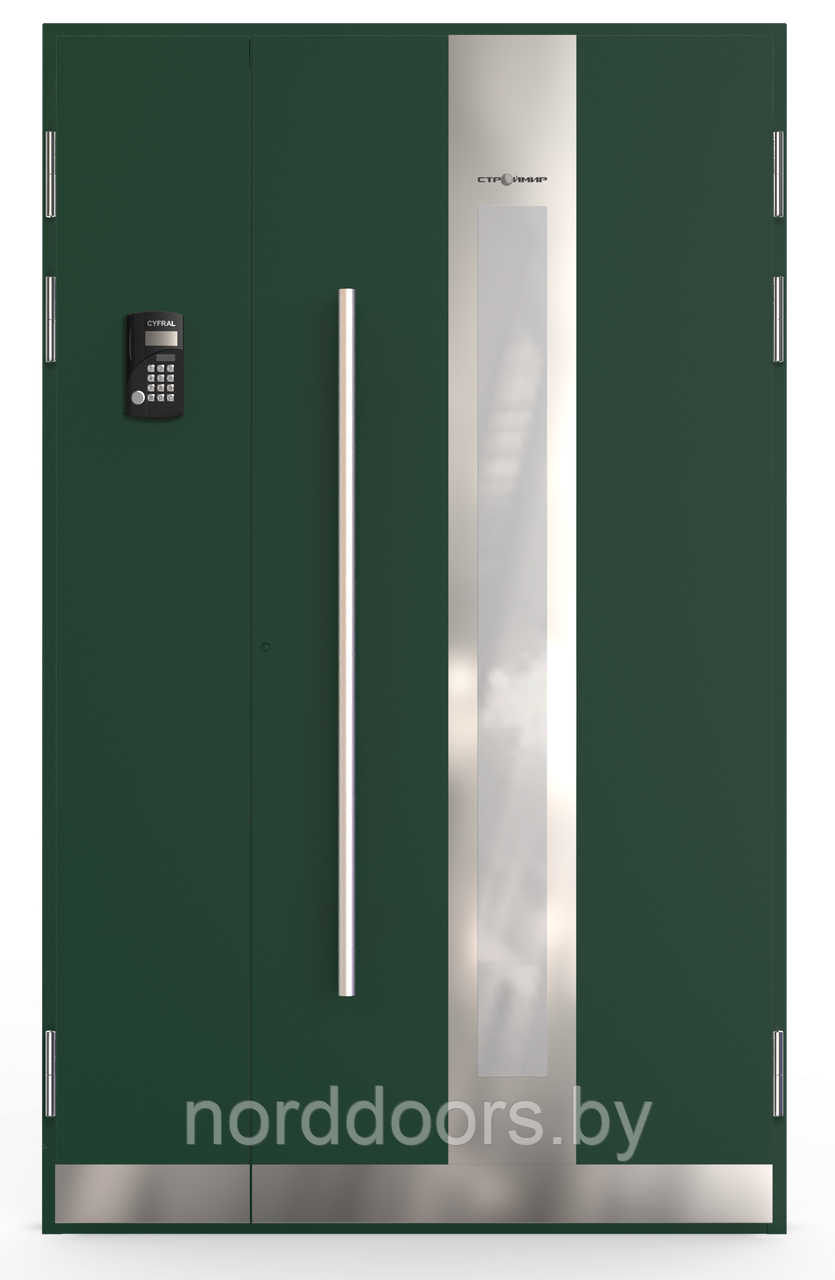 Дверное полотно и порог коробки дополнительно защищены от коррозии и истирания накладками из нержавеющей стали.